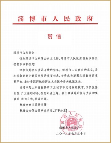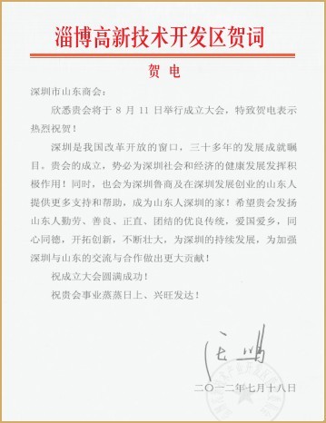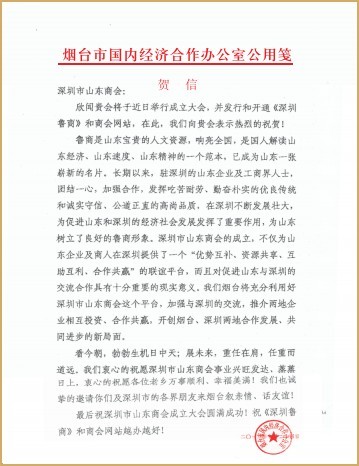 煙臺(tái)市國內(nèi)經(jīng)濟(jì)合作辦公室賀信 淄博高新技術(shù)開發(fā)區(qū)信