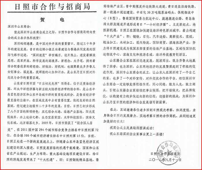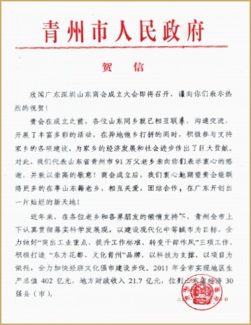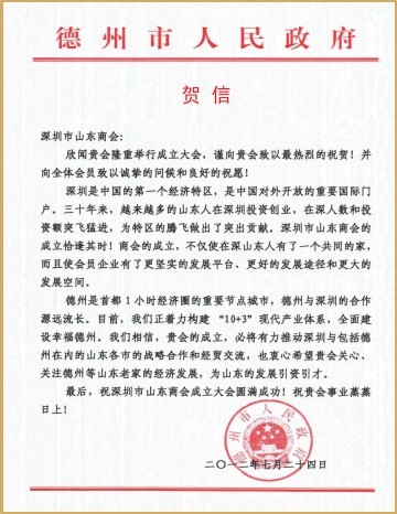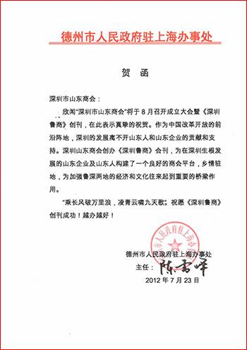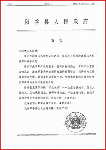陽谷縣人民政府賀信 德州市人民政府駐上海辦事處賀信