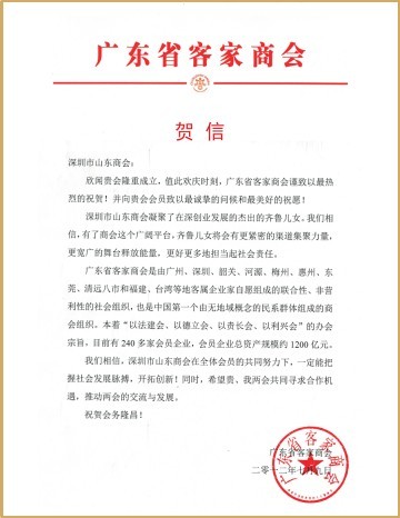 廣東省山東商會賀信 廣東省客家商會賀信
