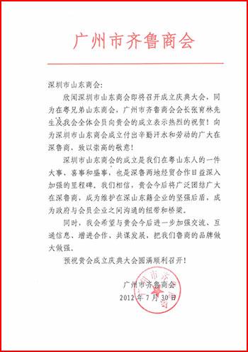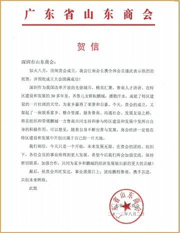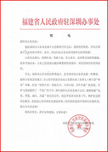 廣州市齊魯商會賀信 福建省人民政府駐深圳辦事處賀信