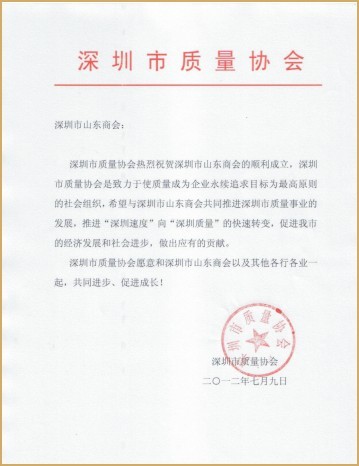 深圳市質(zhì)量協(xié)會賀信 深圳市電子商務(wù)協(xié)會賀信