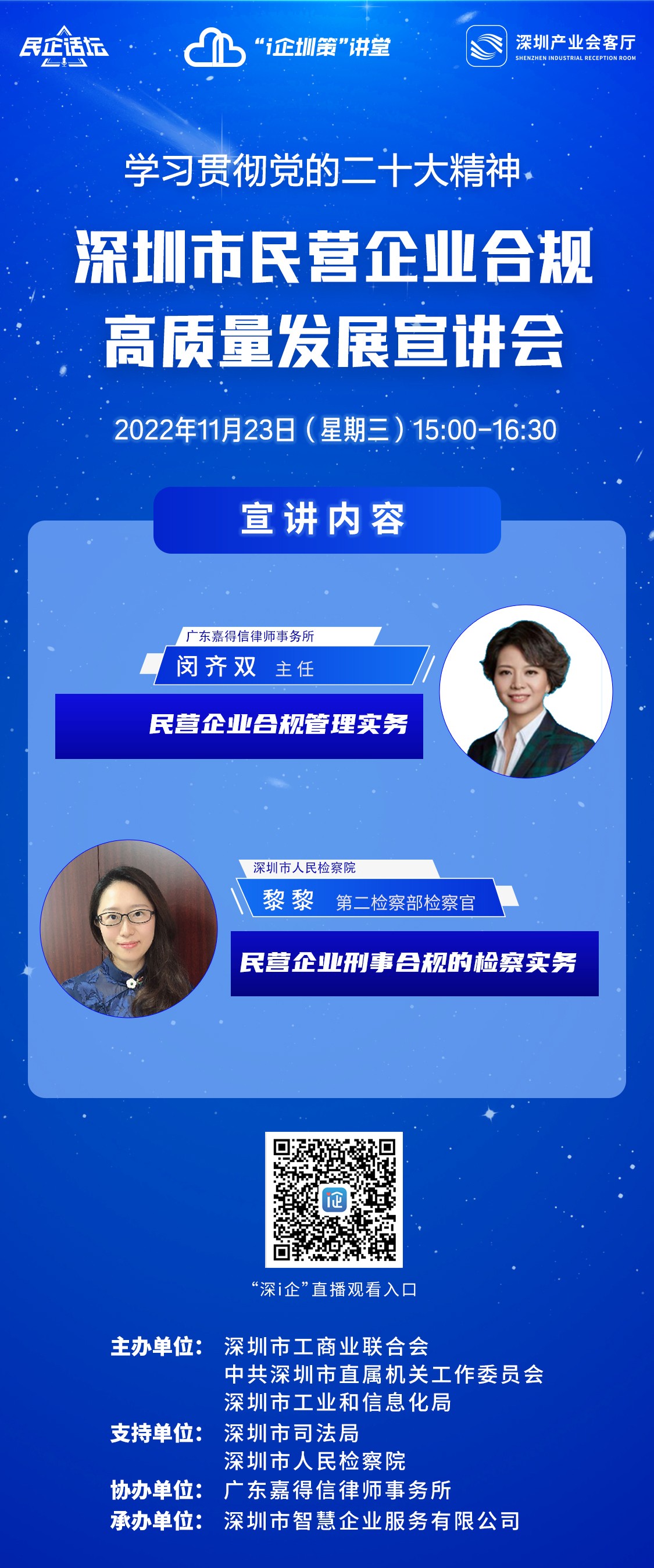 本場宣講會(huì)邀請(qǐng)來自深圳市人民檢察院、廣東嘉得信律師事務(wù)所合規(guī)領(lǐng)域?qū)<?,從?shí)務(wù)出發(fā)詳細(xì)授課講解,指導(dǎo)民營企業(yè)合規(guī)管理建設(shè)?;顒?dòng)以“線上+線下”的形式舉行,“深i企”全程直播,現(xiàn)誠摯邀請(qǐng)企業(yè)家朋友們屆時(shí)掃描下方海報(bào)二維碼觀看。