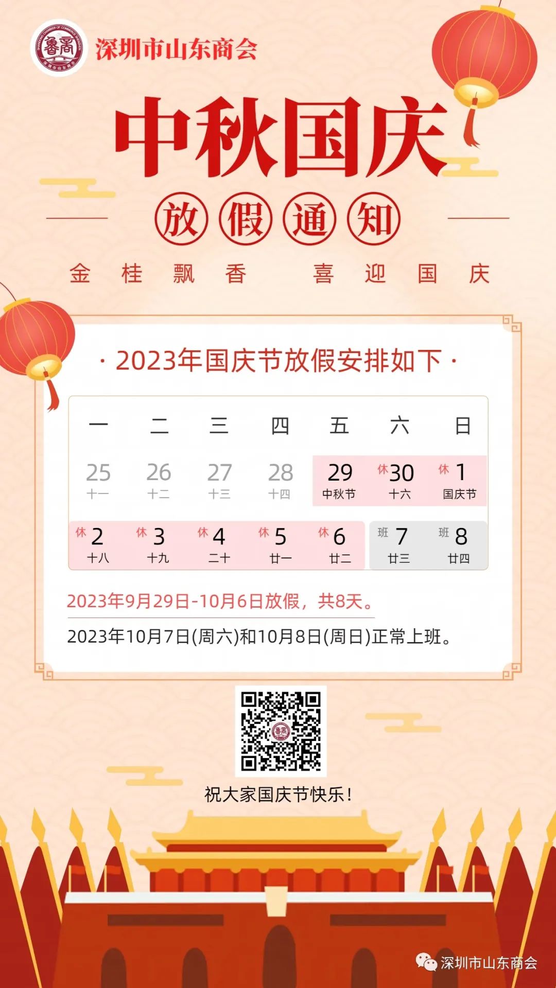 感謝長期以來,對深圳市山東商會工作給予關(guān)心和支持的社會各界朋友,在中秋、國慶雙節(jié)來臨之際,深圳市山東商會恭祝大家節(jié)日快樂、身體安康、闔家團(tuán)圓、萬事順意!
