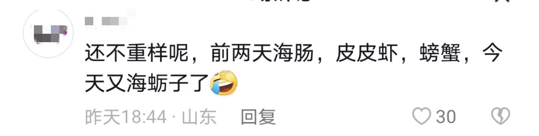 第一次是國(guó)慶時(shí)的趕海,海蠣子多到用桶裝,小螃蟹、瀘沽蝦兩小時(shí)撿五麻袋,平時(shí)上百一斤的海腸和美味的海參,讓山東人海鮮自助吃到撐;