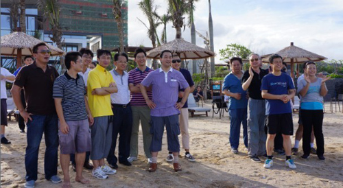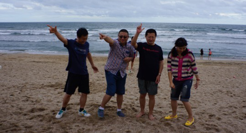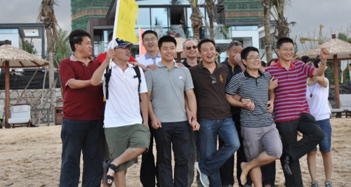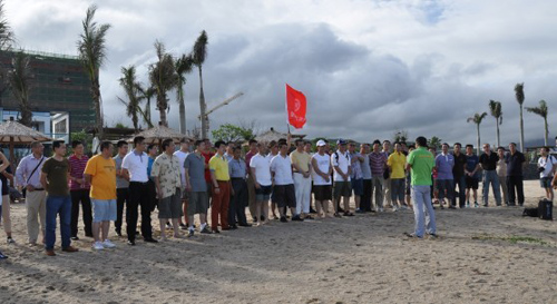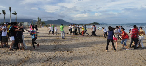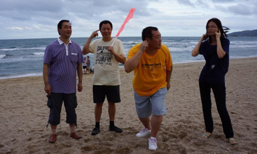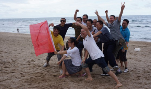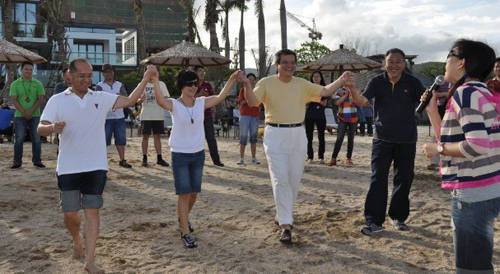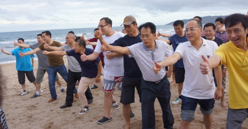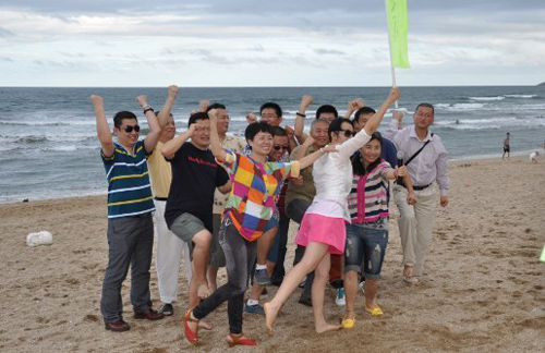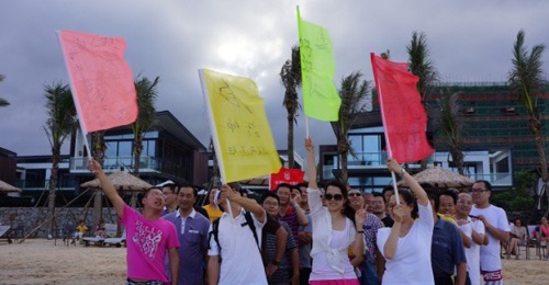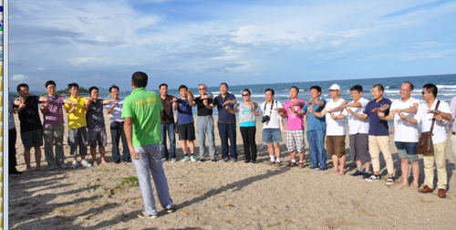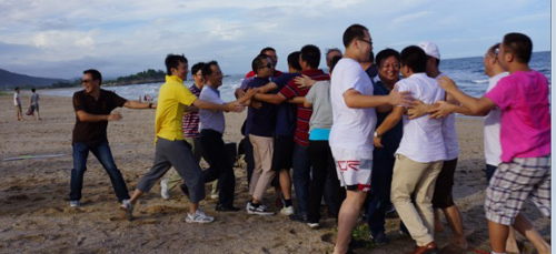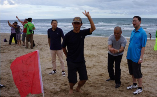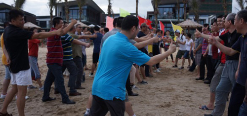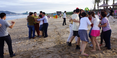 下午三點(diǎn),剛剛風(fēng)雨交加的雙月灣上空露出了燦爛的陽(yáng)光。顧不上旅程勞累的100多位會(huì)員們?cè)诤F骄€酒店會(huì)議廳出席了商會(huì)第三次會(huì)員大會(huì)后,來(lái)到了有著號(hào)稱廣東三亞的惠州稔平半島——著名的雙月灣前海海灣沙灘,拉開了商會(huì)拓展活動(dòng)的帷幕。在贊助商——深圳市陽(yáng)光行俱樂(lè)部專職拓展師的引領(lǐng)下,會(huì)員們首先開始了“報(bào)團(tuán)”的拓展項(xiàng)目,會(huì)員們圍繞成碩大的圓圈,聽著拓展師的號(hào)令,不時(shí)形成三、五、八報(bào)團(tuán)的場(chǎng)景,未能報(bào)上團(tuán)的只好被淘汰,表演扭動(dòng)腰臀的節(jié)目,引起大家的哄笑。