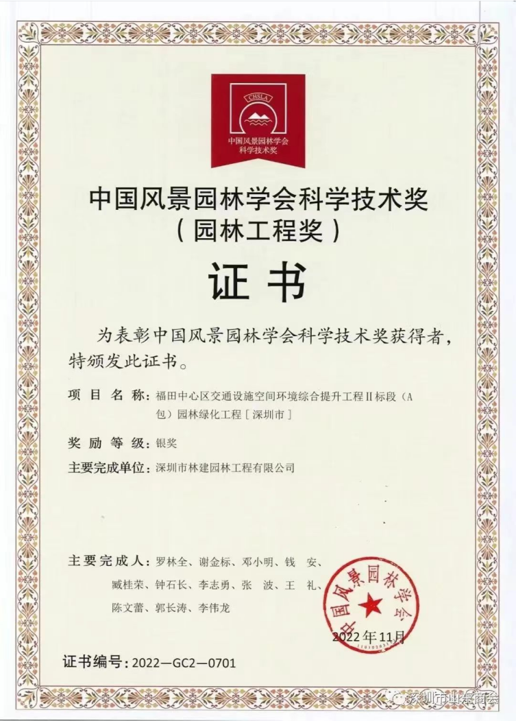 今年初,中國(guó)風(fēng)景園林學(xué)會(huì)科學(xué)技術(shù)獎(jiǎng)(園林工程獎(jiǎng)) 評(píng)選結(jié)果正式揭曉,深圳市林建園林工程有限公司“福田中心區(qū)交通設(shè)施空間環(huán)境綜合提升工程Ⅱ標(biāo)段(A包)園林綠化工程”榮獲國(guó)家園林工程銀獎(jiǎng)。