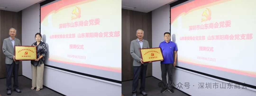 最后,黨委書記王維星同志為近期新成立的深圳市山東泰安商會黨支部、深圳市山東萊陽商會黨支部授牌。