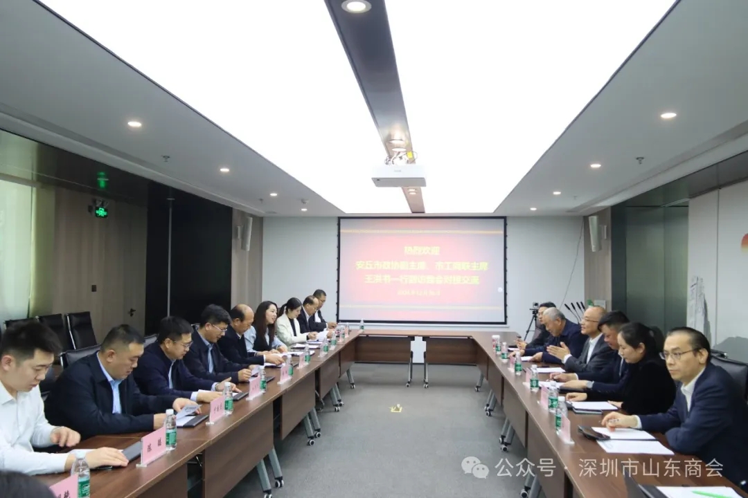 2024年12月26日,安丘市政協(xié)副主席、市工商聯(lián)主席王洪書,安丘市委統(tǒng)戰(zhàn)部分管日常工作的副部長蘇瑛,安丘市委組織部副部長、市黨員教育中心主任董曉娜,安丘市委統(tǒng)戰(zhàn)部副部長、市僑辦主任、市港澳辦主任牛茂華,安丘市投促中心副主任李明,安丘市政府駐深圳辦事處主任馬翀,安丘市農(nóng)投集團副總經(jīng)理于國慶等一行15人到訪我會對接交流,我會會長王立新,副會長王剛,黨委辦公室主任張含增,理事高樹謙,執(zhí)行秘書長兼辦公室主任陳振永,副秘書長、濰坊商會秘書長扈炳燕等熱情接待并座談交流。