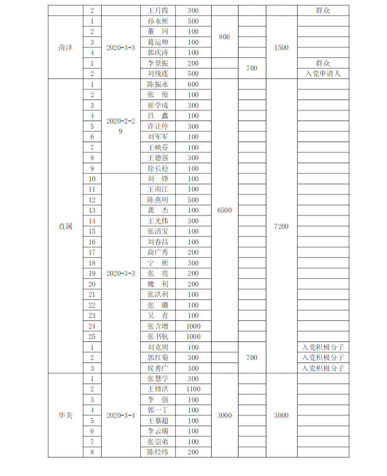 中共中央組織部發(fā)出號(hào)召后,習(xí)近平總書記為支持新冠肺炎疫情防控工作帶頭捐款。“疫情就是命令,防控就是責(zé)任”。深圳市山東商會(huì)黨委在深圳市社會(huì)組織黨委的部署安排下認(rèn)真做好了黨員自愿捐款的接收工作。黨員同志們自覺自愿、積極響應(yīng),在短短幾天內(nèi),108名黨員共捐款項(xiàng)35716元(另有8名非黨員也執(zhí)意捐款2500元)。3月6日,商會(huì)黨委已將黨員捐助的35716元款項(xiàng)如數(shù)上繳到市社會(huì)組織黨委(其他非黨員的捐款,商會(huì)黨委將根據(jù)疫情情況捐助到其他需要捐助的地方)。